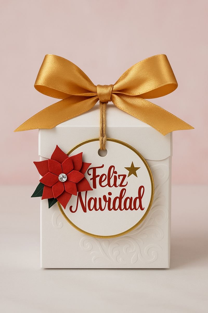 Hermosa caja dulcera ideal para Navidad, perfecta para regalos, detalles empresariales, desayunos sorpresa y emprendimientos creativos. Incluye una etiqueta circular con flor navideña en capas, que le da un acabado elegante, delicado y muy profesional.