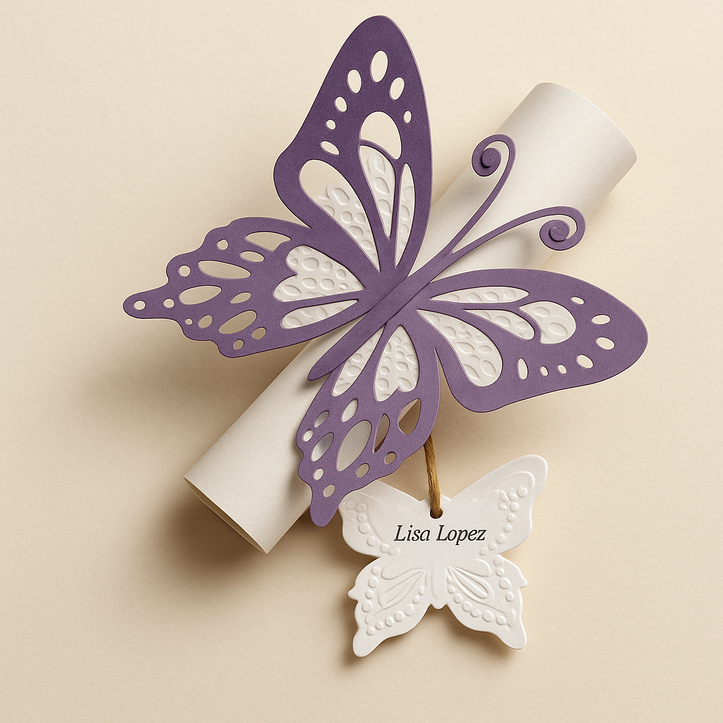 Esta hermosa invitación con mariposa calada, diseñada en capas con textura y acabados delicados, es ideal para eventos elegantes como quinceañeras, bodas, bautizos, primera comunión y cumpleaños especiales. Su diseño incluye alas caladas, base texturizada y una mariposa pequeña para personalizar con el nombre.