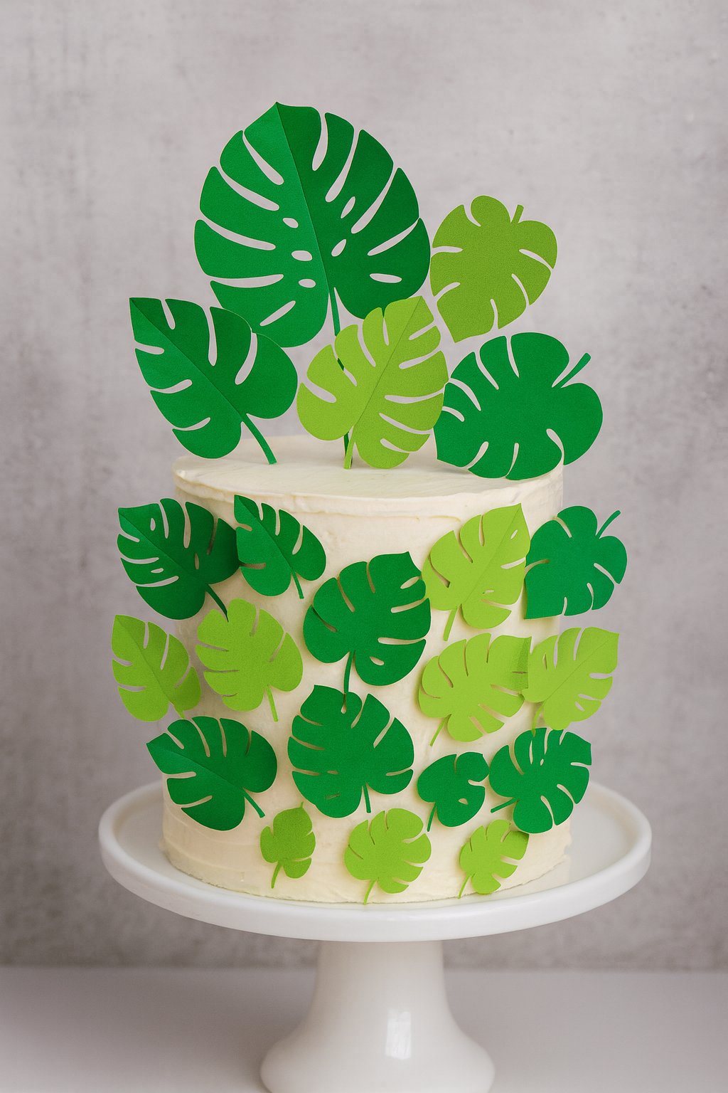 Incluye un set completo de más de 20 diseños diferentes de hojas Monstera, ideales para decorar tortas, centros de mesa, arreglos, toppers, fondos selváticos y proyectos creativos.