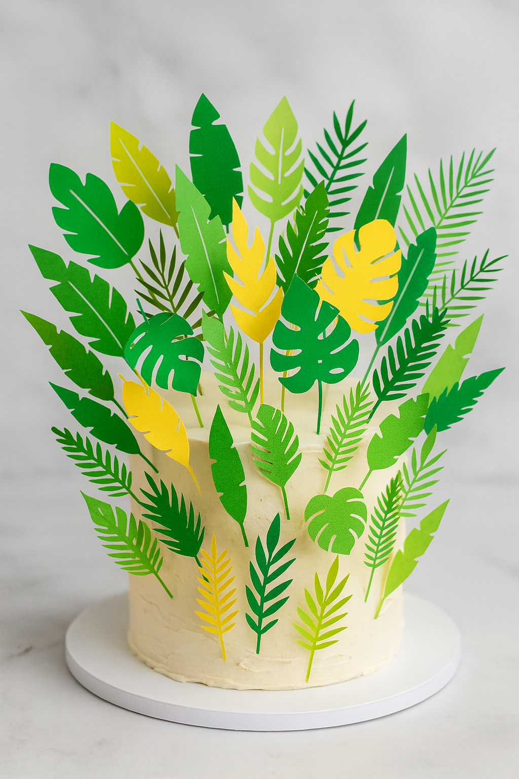 Incluye un set completo de más de 25 hojas tropicales estilo Platanillo, perfectas para crear decoraciones impactantes en tortas, centros de mesa, desayunos sorpresa, arreglos selváticos y toppers.