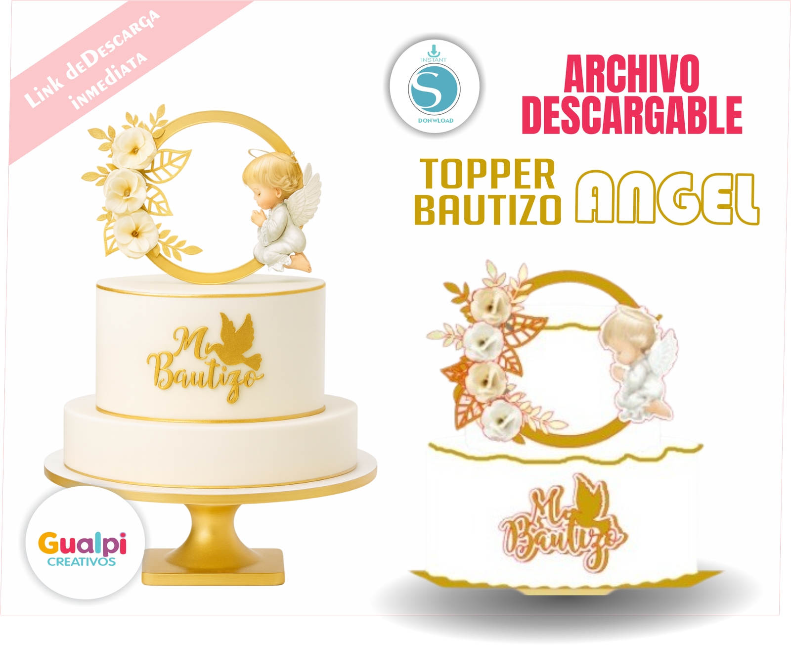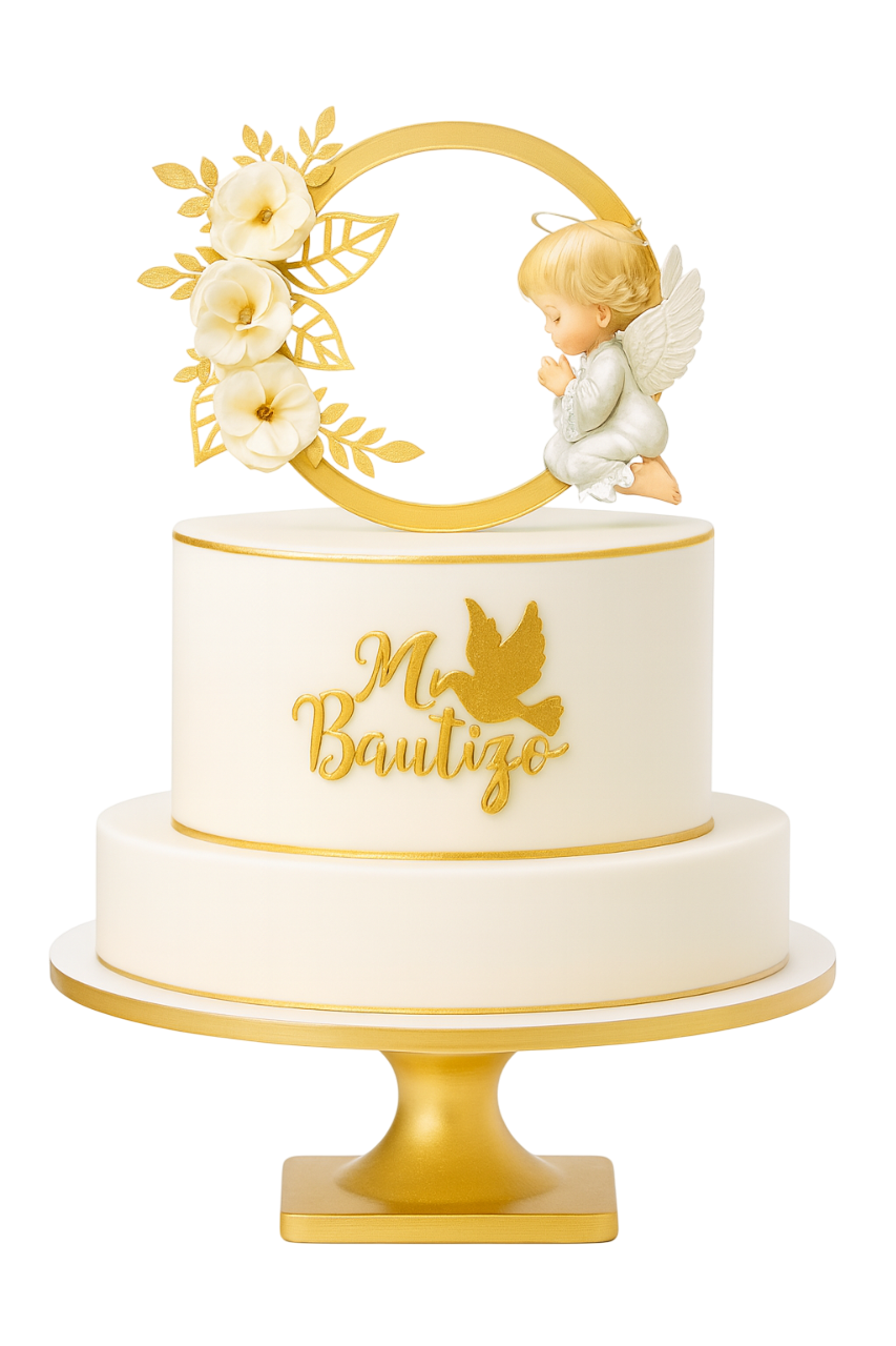 Dale un toque tierno y divertido a tus tortas con este kit de toppers digitales para bautizo Angelito dorado rosas💕.