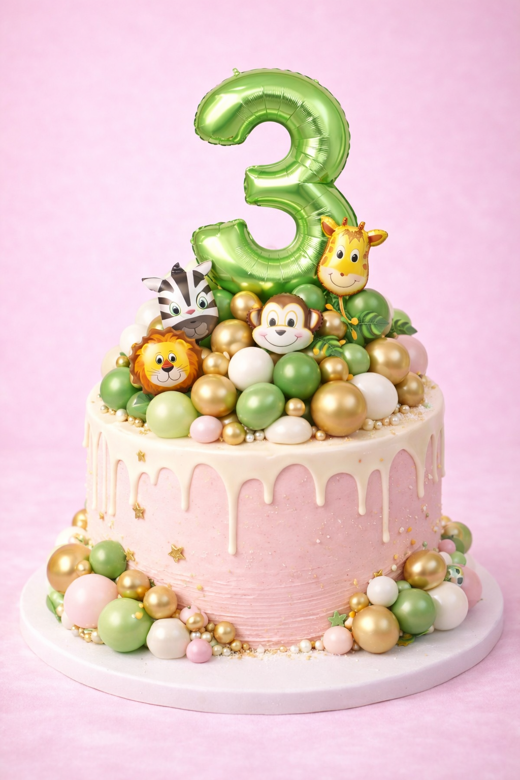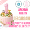 Descarga este hermoso topper de animales de la selva número globo metalizado 3D, ideal para decorar tortas de cumpleaños infantiles con un estilo moderno, tierno y en tendencia.