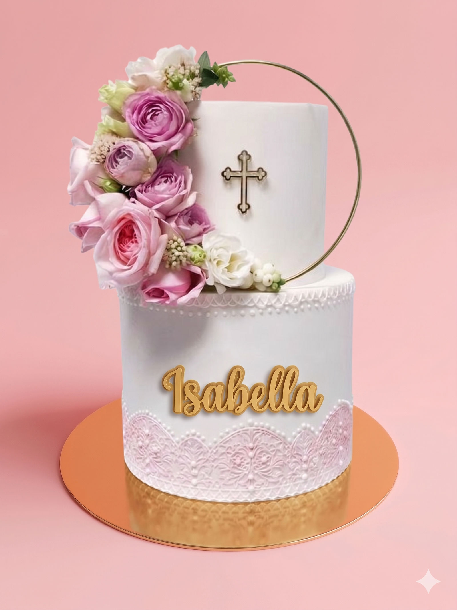 El diseño combina un aro decorativo con flores y una cruz central, perfecto para celebraciones de bautizo tanto de niña como de niño.