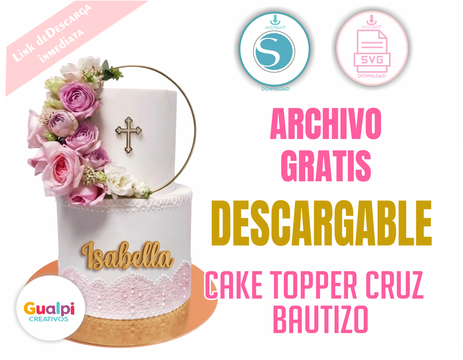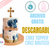 Descarga este hermoso plantilla topper de bautizo con aro, cruz y flores, ideal para decorar tortas con un estilo elegante, delicado y personalizado.