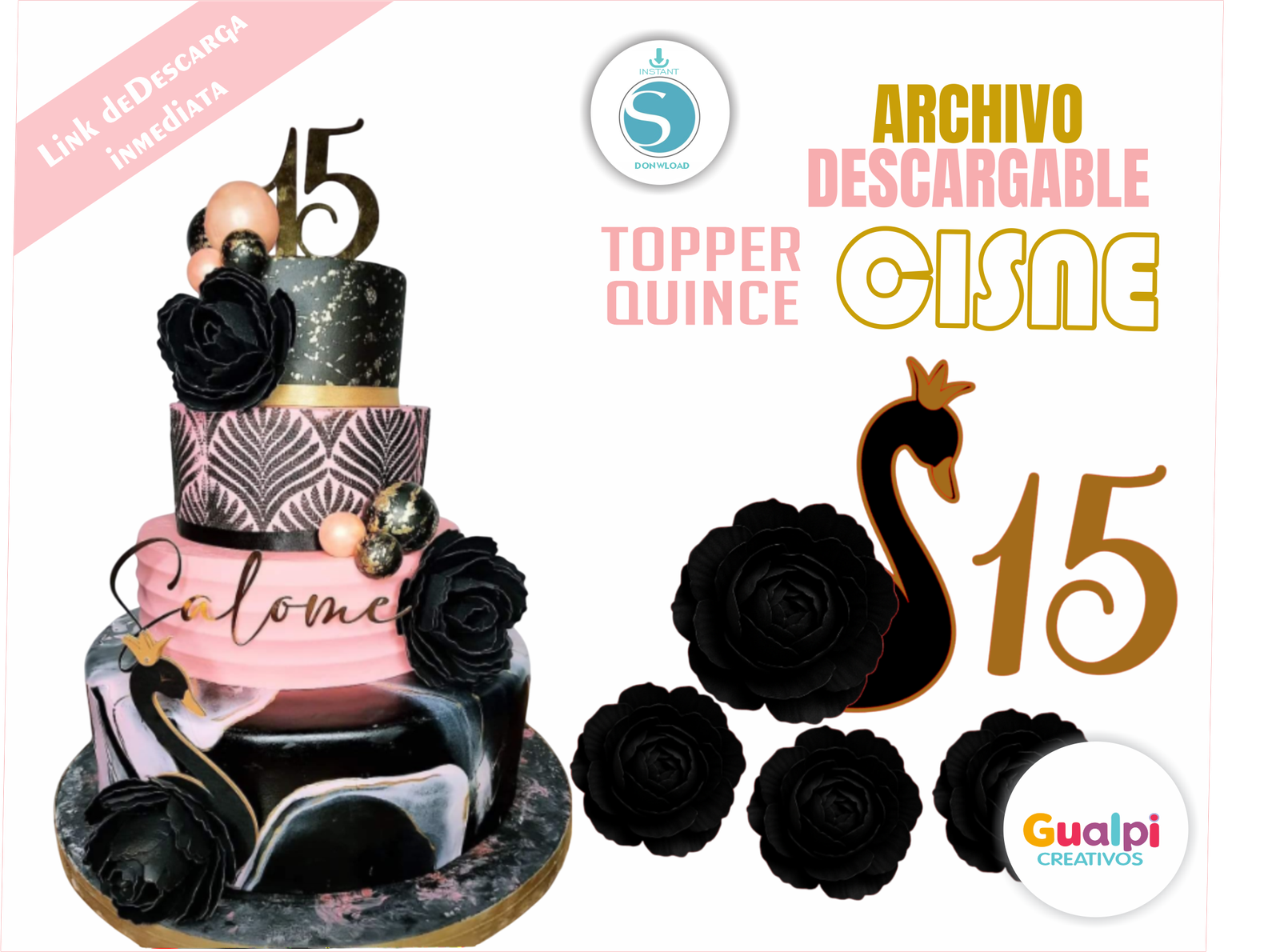 Incluye un cisne negro con corona dorada, flores peonías en papel y el número 15, combinando tonos negro, dorado y rosa pastel para un resultado de ensueño. 🌸