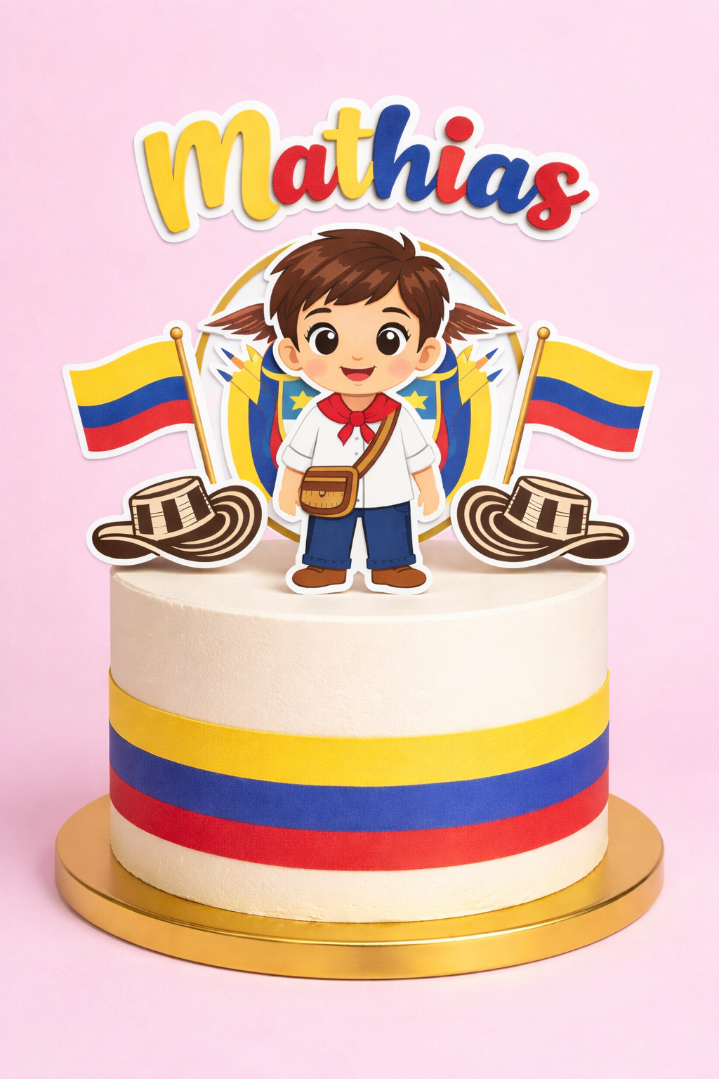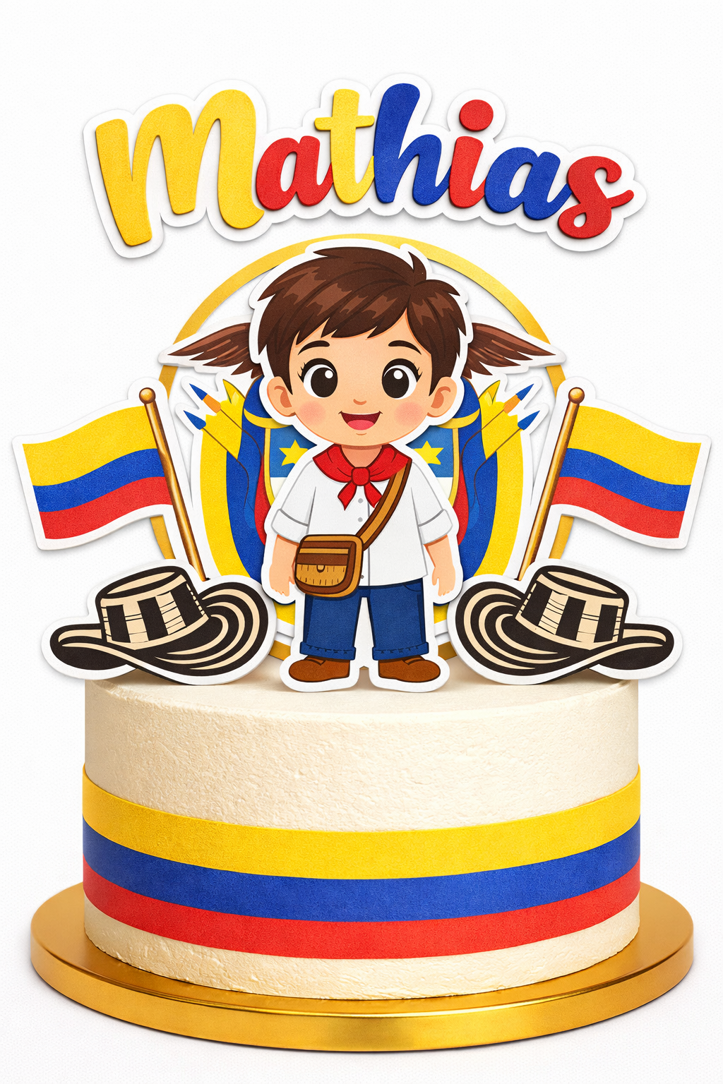 Este diseño combina elementos tradicionales colombianos con un estilo infantil encantador, perfecto para celebraciones únicas.