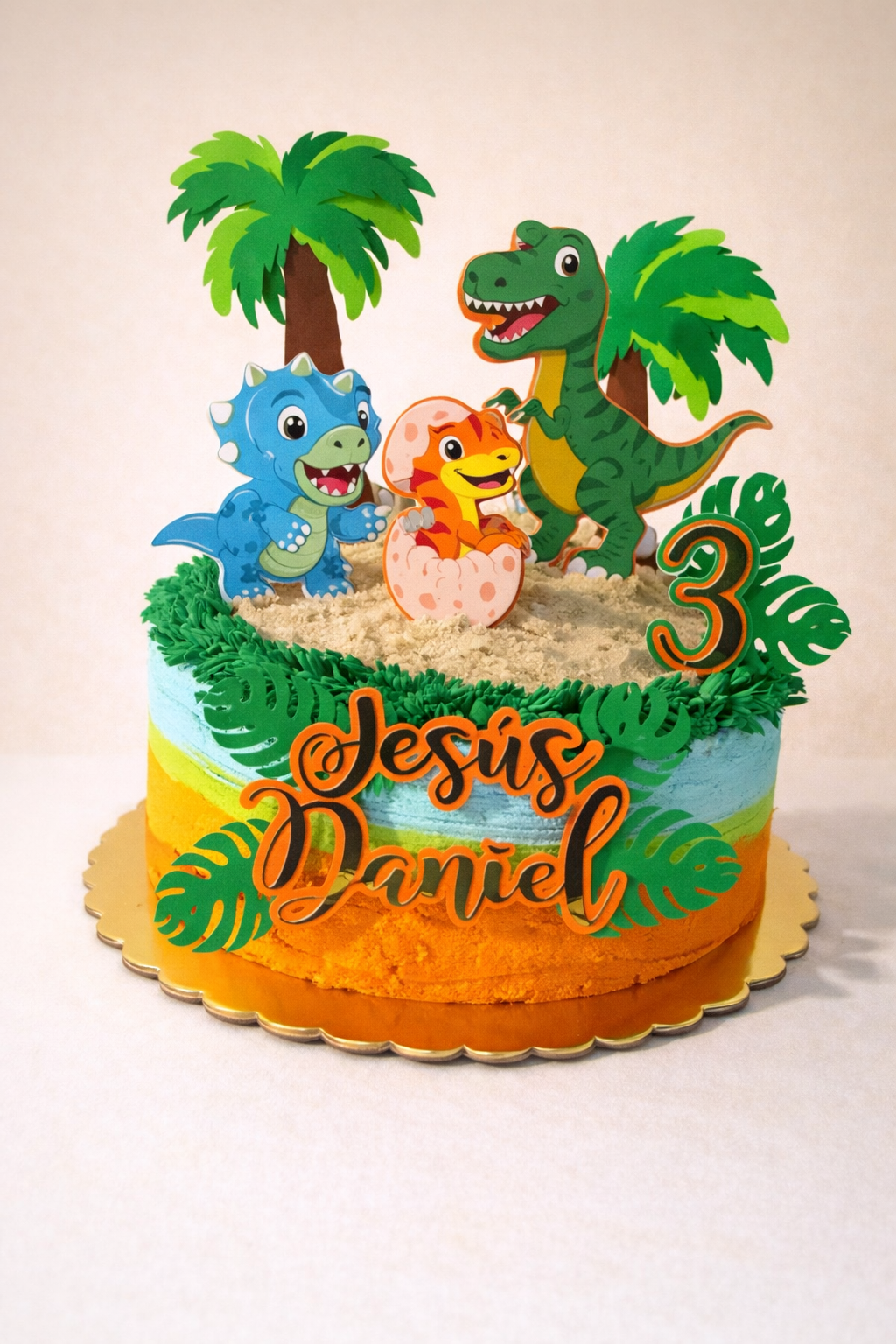 Diseñado con varios dinosaurios, palmeras y elementos naturales que crean una escena alegre y llamativa sobre el pastel.