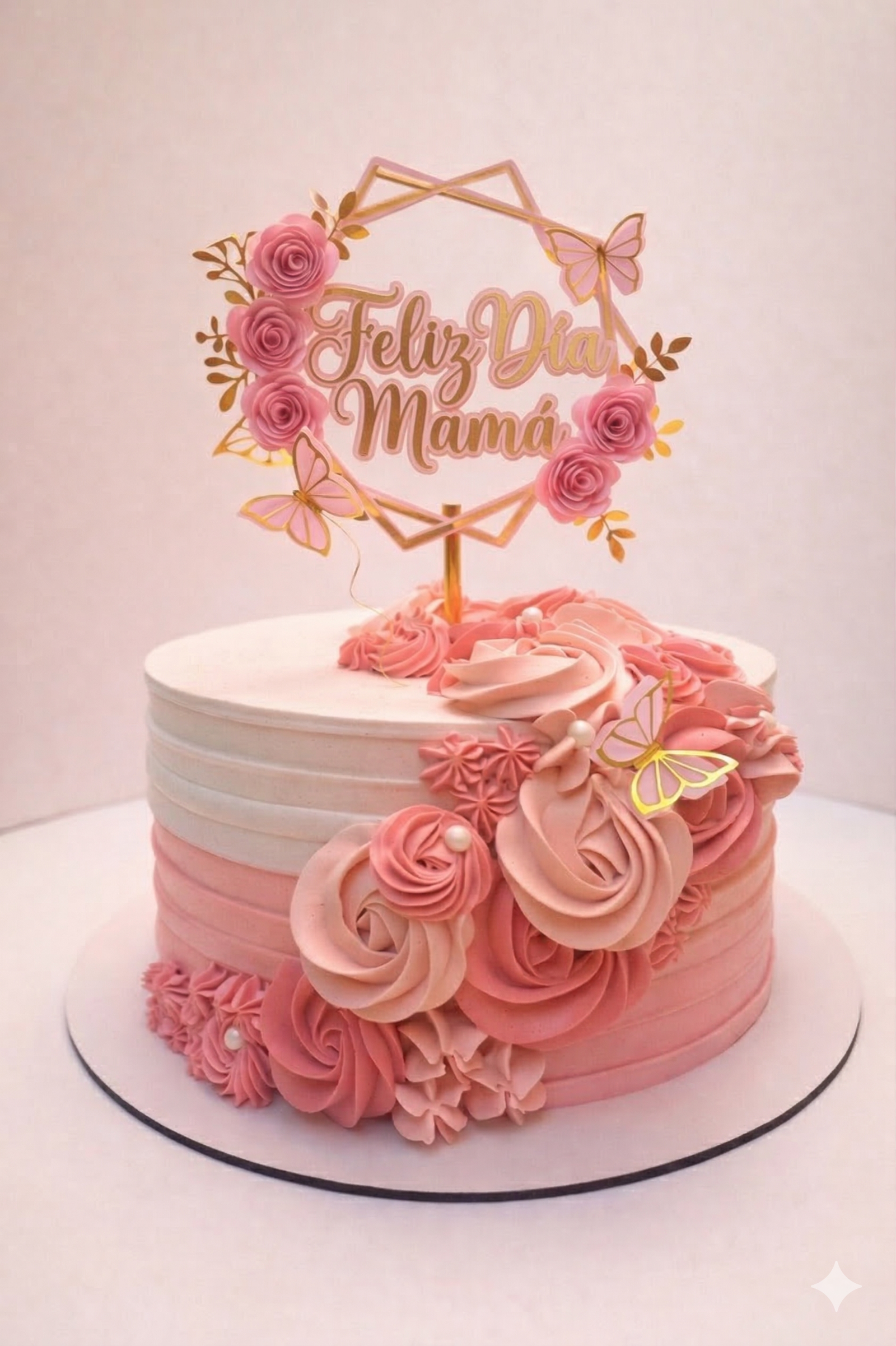 El diseño incluye una estructura geométrica decorativa con la frase “Feliz Día Mamá”, acompañada de rosas y mariposas, creando una decoración perfecta para celebrar a mamá en su día especial.