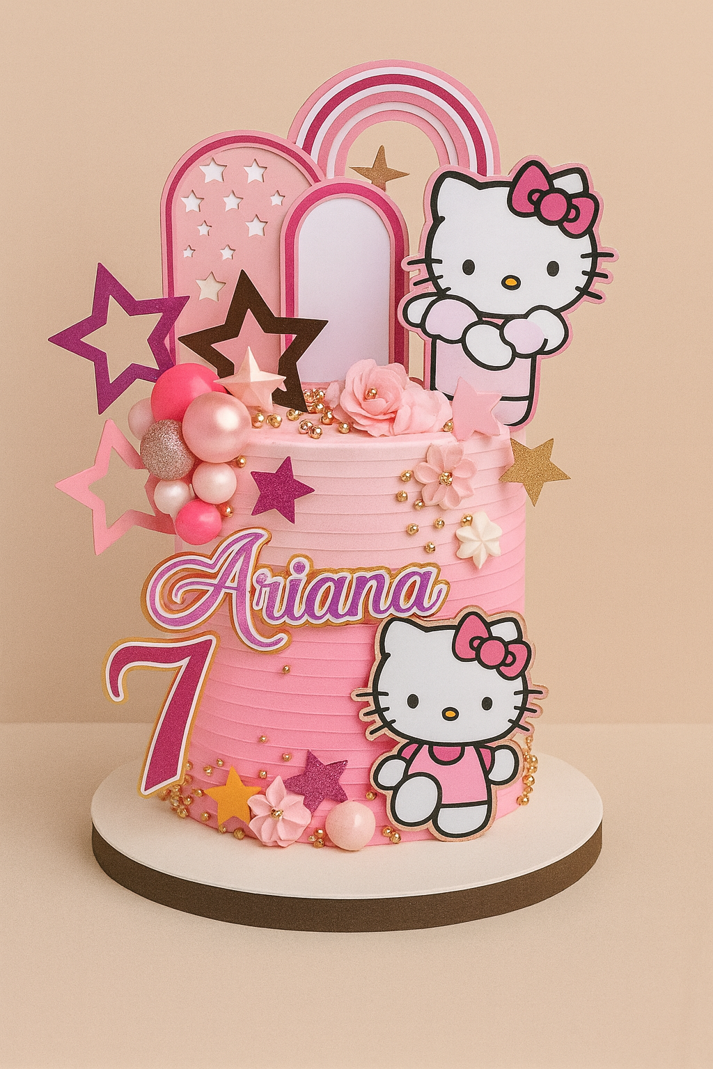 Este diseño permite personalizar nombre y edad, ideal para cumpleaños infantiles con estilo Hello Kitty, arcoíris, estrellas y decoraciones suaves.