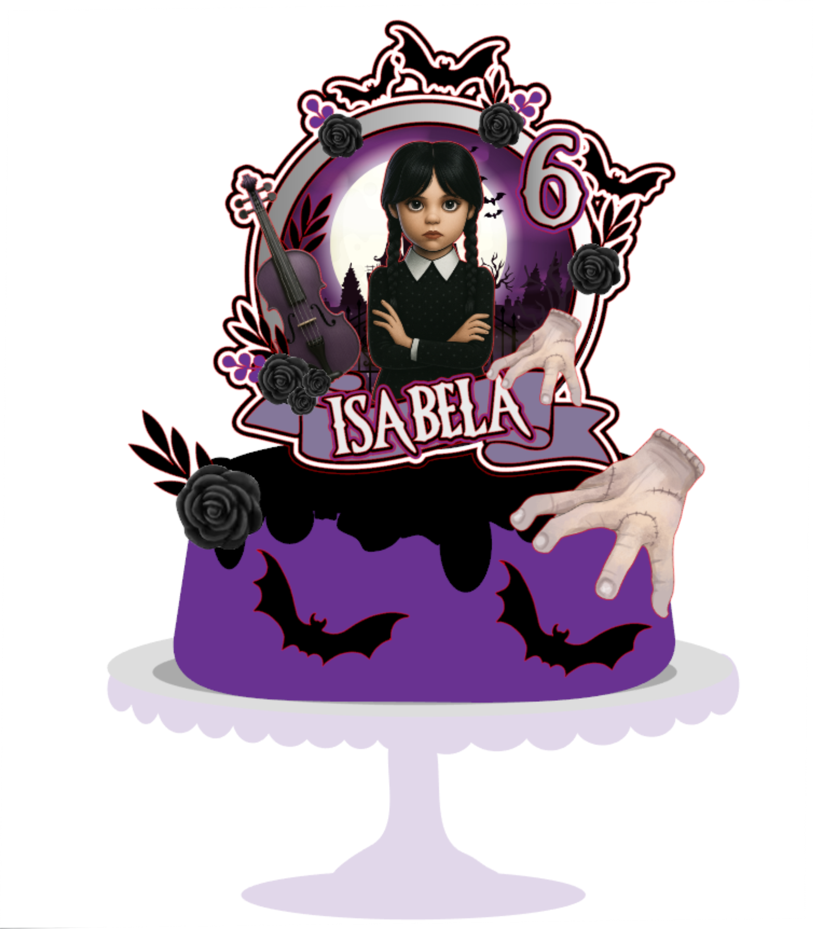Haz que tu celebración destaque con este Topper de Merlina Addams, inspirado en el estilo gótico y misterioso de la serie.