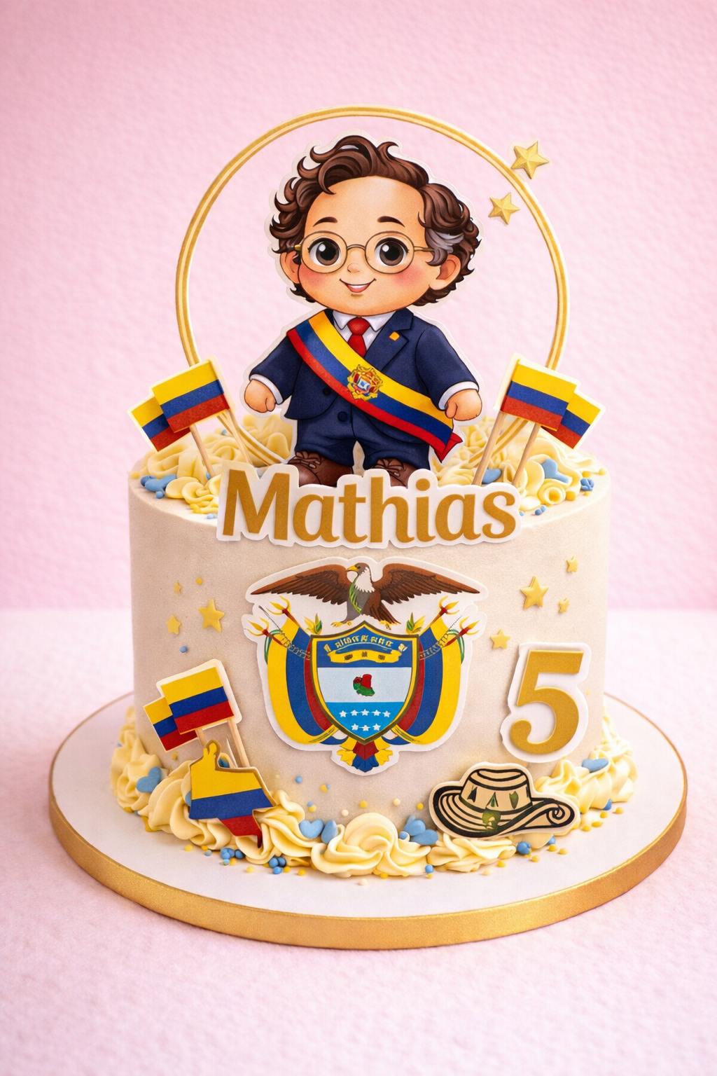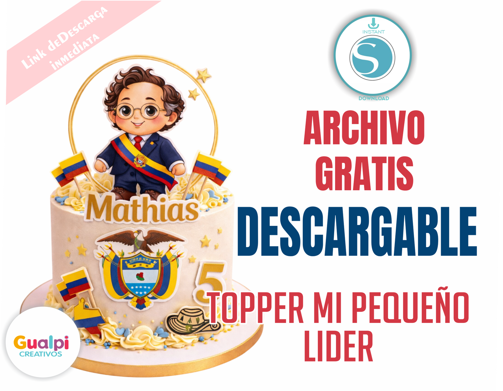 Descarga este hermoso topper “Mi Pequeño Líder” personalizado con nombre y edad, ideal para decorar tortas de cumpleaños con temática colombiana.