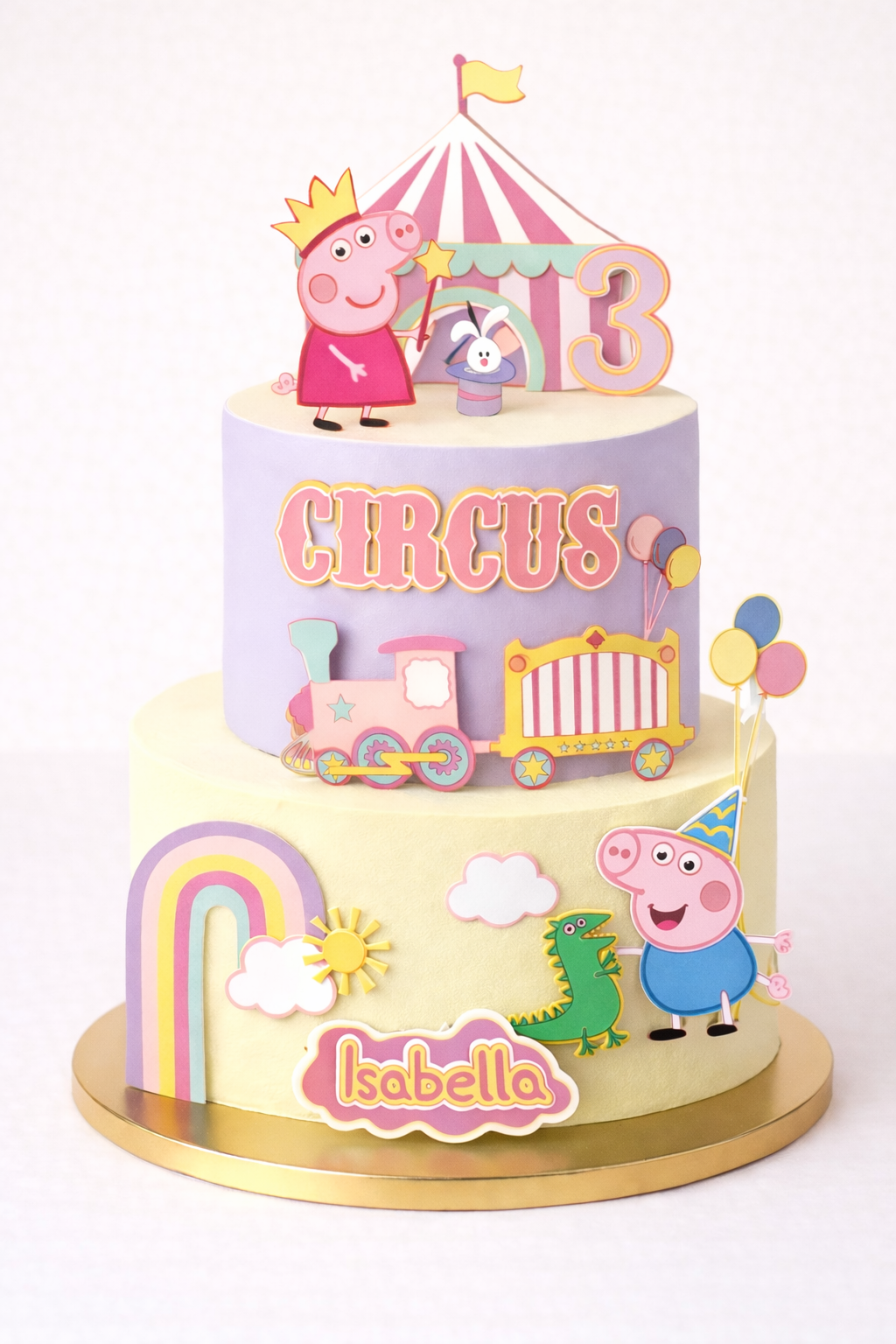 Descarga este encantador topper de Peppa Pig con temática de circo, ideal para decorar tortas infantiles llenas de color, alegría y fantasía. El diseño incluye carpa de circo, tren, globos y personajes, creando una escena divertida y llamativa perfecta para cumpleaños de niños y niñas.