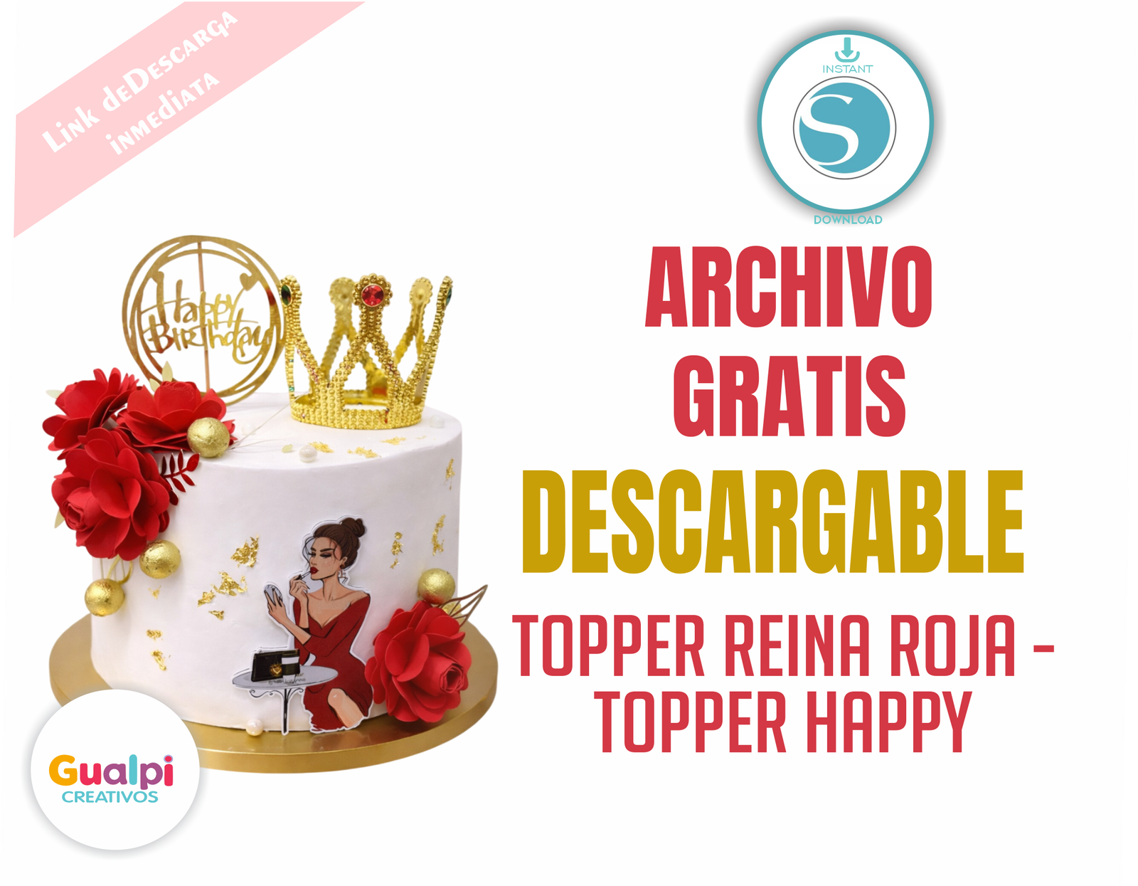 Descarga este espectacular topper Reina Roja ideal para cumpleaños elegantes y temáticas glam.