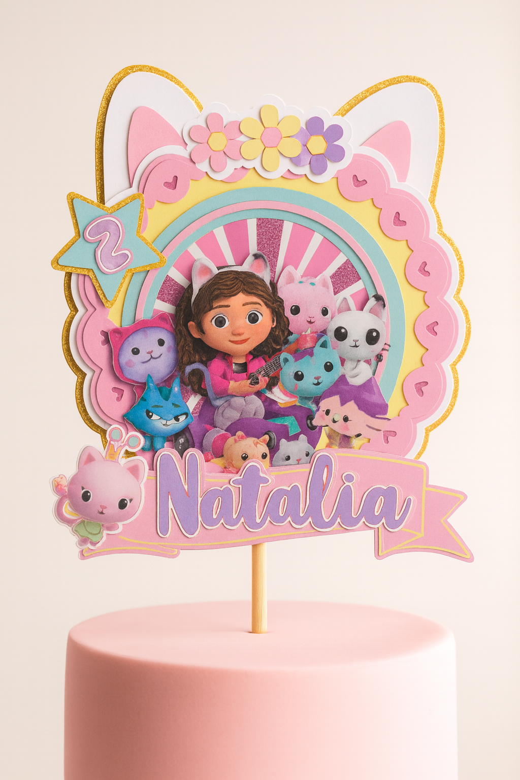 Descarga este hermoso topper shaker inspirado en Gabby, ideal para decorar tortas infantiles de cumpleaños. El diseño incluye Gabby y sus amigos gatitos, arcoíris, detalles tiernos y espacio para nombre y edad, creando una decoración alegre, colorida y muy llamativa.